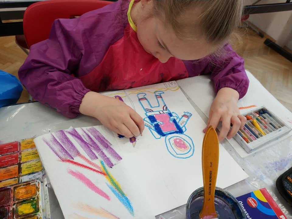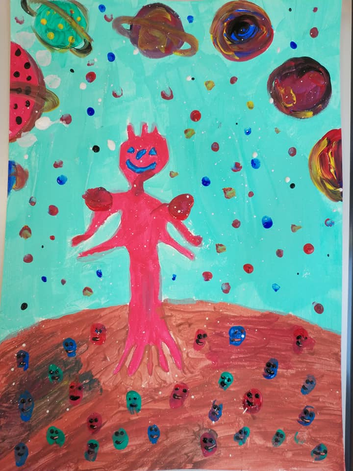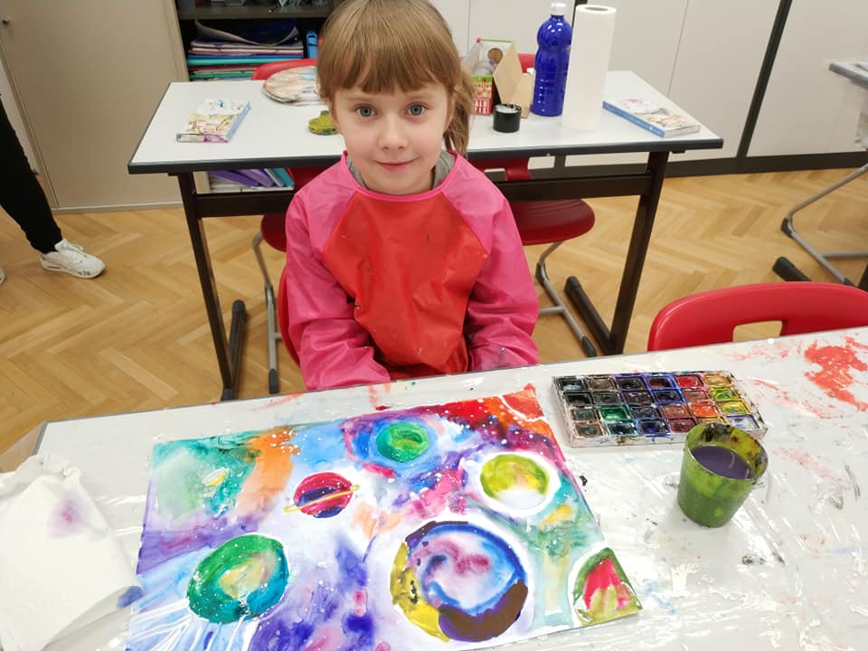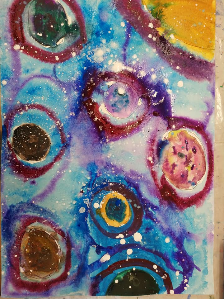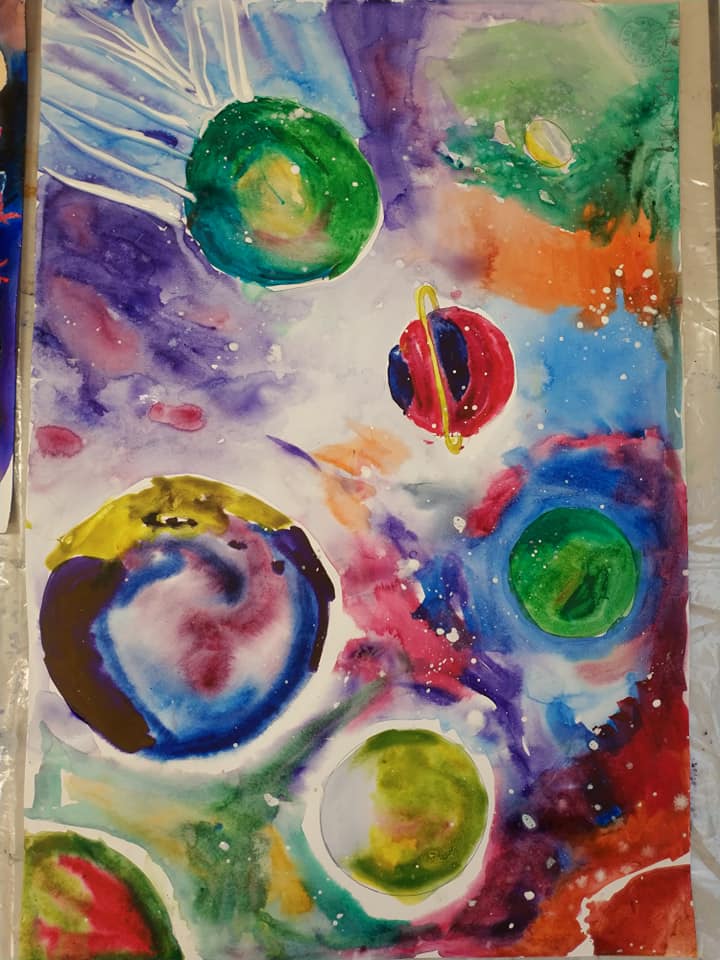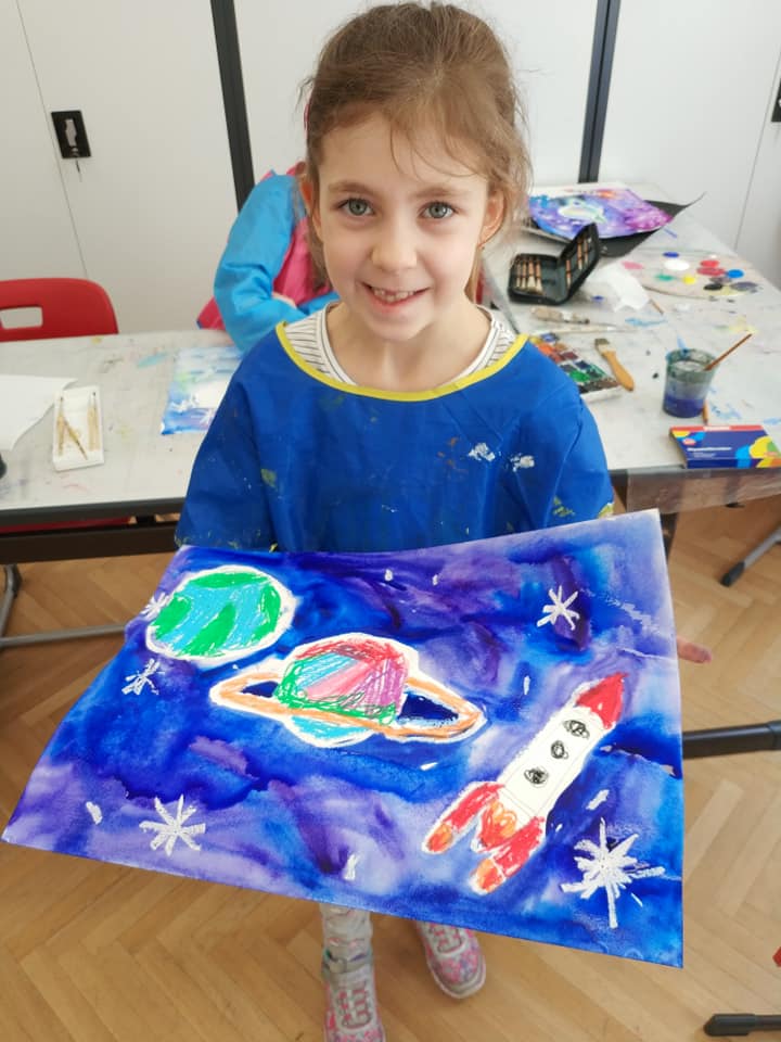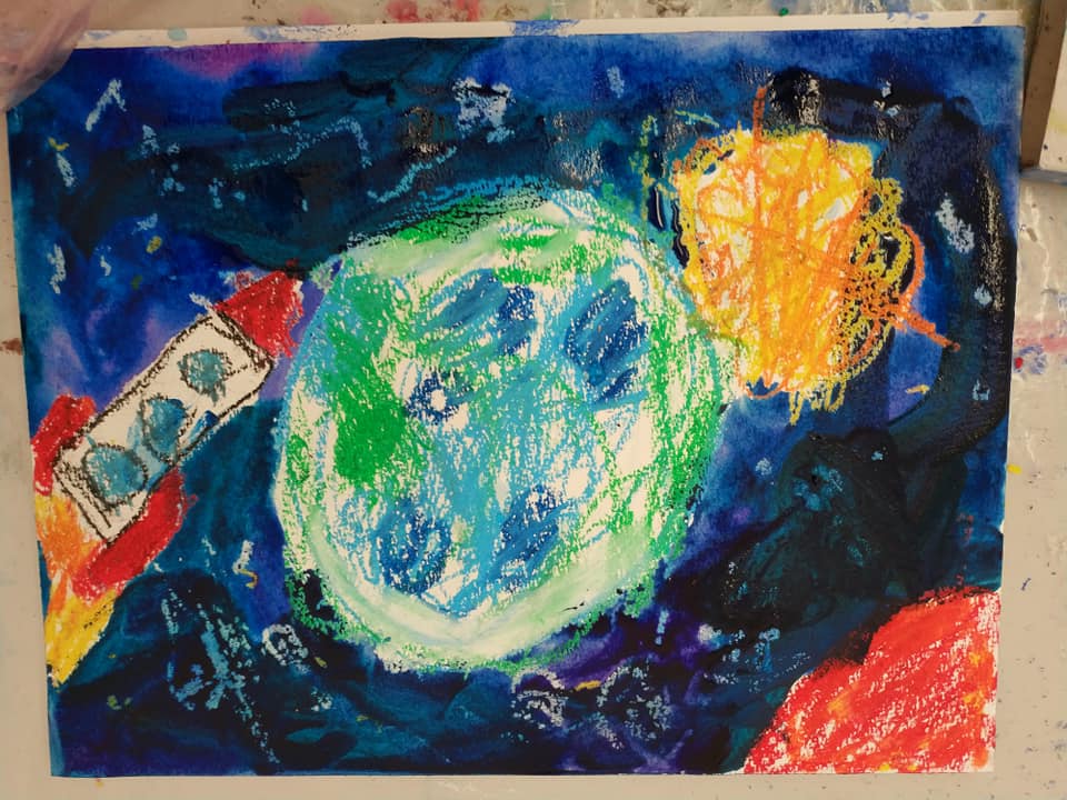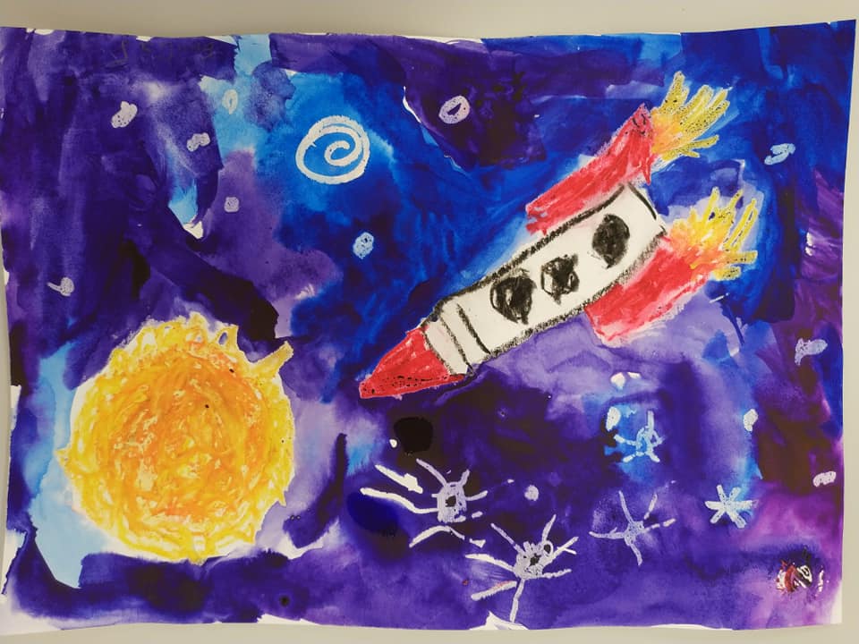 Техника- по выбору учащихся, изучаем как нарисовать человека- космонавта, ракету, что такое солнечная система, планеты, звёзды, спутники, орбиты, галактика, вселенная, метеориты, астероиды, почему падают звёзды, как дышит космонавт в космосе и фантазирует на тему: кого он может там встретить